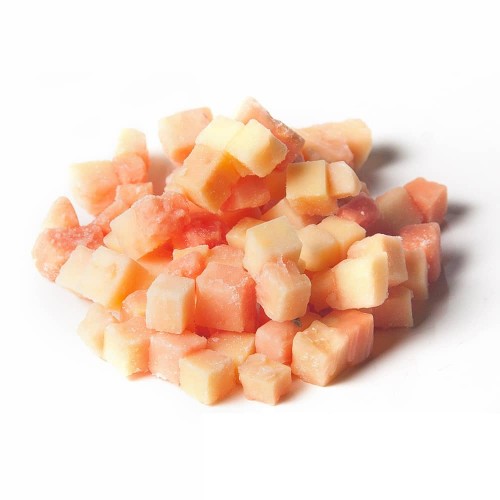 Packaging: A box with 10 kg individual quickly frozen papaya pieces in 10 x 10 mm cubes with no skin.