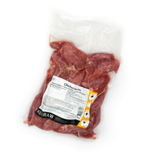 Chicken necks with muscle meat. Contains relatively soft bone and is therefore suitable for low experienced BARF eating pets.